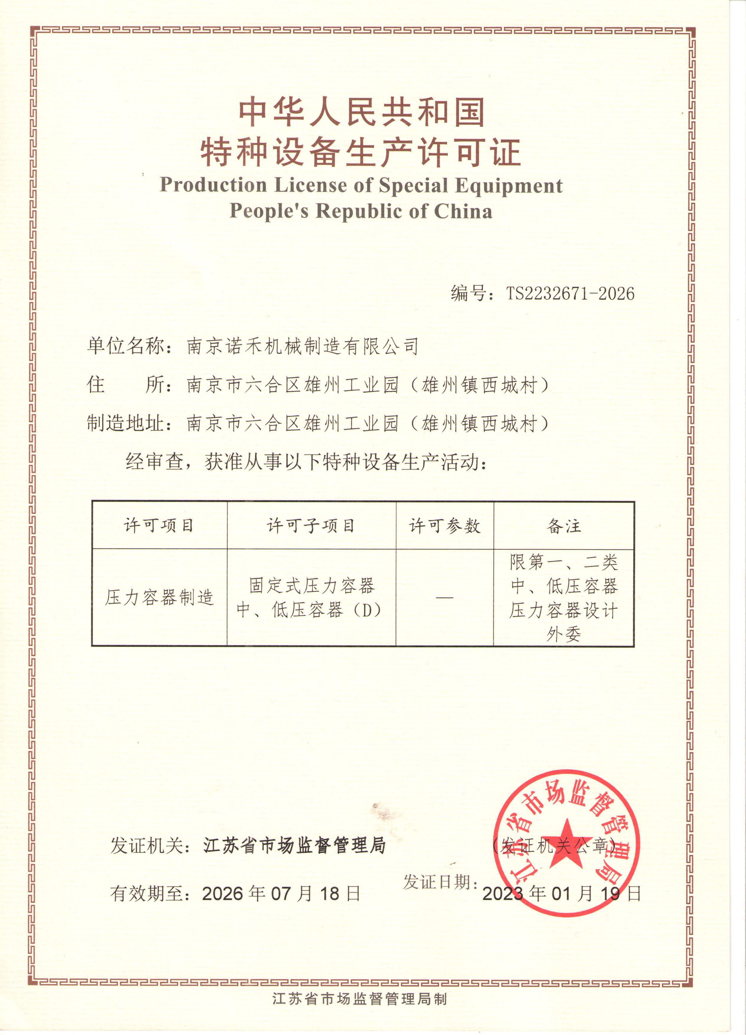 公司取得一、二類壓力容器生產(chǎn)資質(zhì); 證書編號:TS2232671-2026